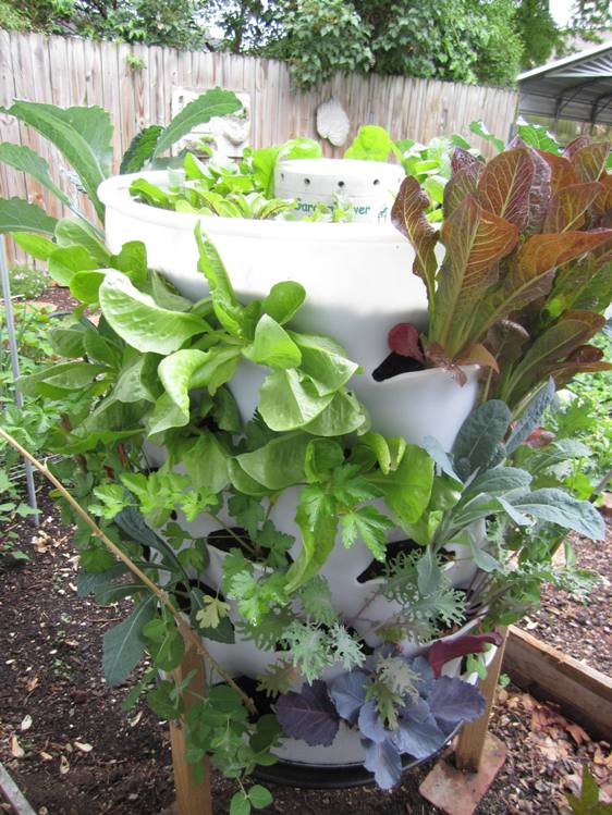 Every spring I plant salad greens in my Garden Tower and an old salvaged sink. My tradition is to go to the winter farmers market and buy starts from a farmer of my acquaintance, Laura Karr. I wrote about her farm, KG Acres, for this Farm Indiana piece. She was also the source of my perennial sorrel plants, which give a lovely lemony flavor to salads in early spring.
